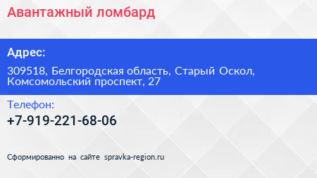 Авантажный, ломбард по адресу 309518, Белгородская область, Старый Оскол, Комсомольский проспект, 27 в дальнейшем Организация, размещена в следующих категориях: