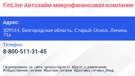 FinLine-Автозайм, микрофинансовая компания по адресу 309514, Белгородская область, Старый Оскол, Ленина, 71а в дальнейшем Организация, размещена в следующих категориях: