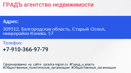 ГРАДЪ, агентство недвижимости по адресу 309512, Белгородская область, Старый Оскол, микрорайон Конева, 17 в дальнейшем Организация, размещена в следующих категориях: