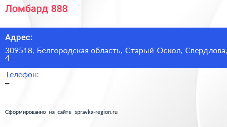 Ломбард 888 по адресу 309518, Белгородская область, Старый Оскол, Свердлова, 4 в дальнейшем Организация, размещена в следующих категориях: