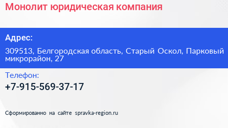 Монолит, юридическая компания по адресу 309513, Белгородская область, Старый Оскол, Парковый микрорайон, 27 в дальнейшем Организация, размещена в следующих категориях: