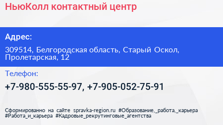 НьюКолл, контактный центр по адресу 309514, Белгородская область, Старый Оскол, Пролетарская, 12 в дальнейшем Организация, размещена в следующих категориях: