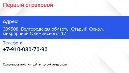 Первый страховой по адресу 309508, Белгородская область, Старый Оскол, микрорайон Ольминского, 17 в дальнейшем Организация, размещена в следующих категориях: