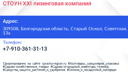 СТОУН-XXI, лизинговая компания по адресу 309508, Белгородская область, Старый Оскол, Советская, 13а в дальнейшем Организация, размещена в следующих категориях: