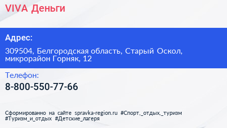 VIVA Деньги по адресу 309504, Белгородская область, Старый Оскол, микрорайон Горняк, 12 в дальнейшем Организация, размещена в следующих категориях: