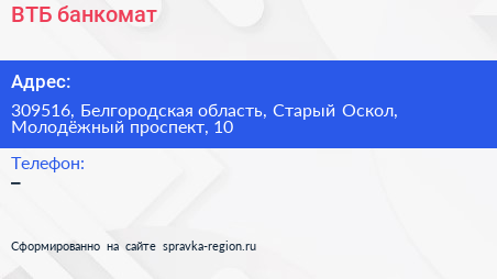 ВТБ, банкомат по адресу 309516, Белгородская область, Старый Оскол, Молодёжный проспект, 10 в дальнейшем Организация, размещена в следующих категориях: