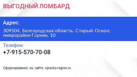 ВЫГОДНЫЙ ЛОМБАРД по адресу 309504, Белгородская область, Старый Оскол, микрорайон Горняк, 10 в дальнейшем Организация, размещена в следующих категориях:
