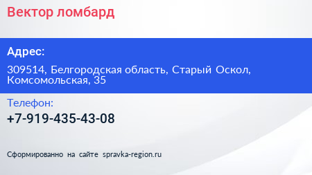 Вектор, ломбард по адресу 309514, Белгородская область, Старый Оскол, Комсомольская, 35 в дальнейшем Организация, размещена в следующих категориях: