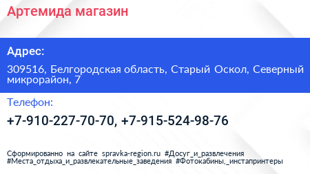 Артемида, магазин по адресу 309516, Белгородская область, Старый Оскол, Северный микрорайон, 7 в дальнейшем Организация, размещена в следующих категориях: