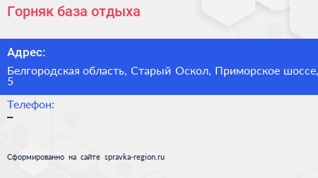 Горняк, база отдыха по адресу Белгородская область, Старый Оскол, Приморское шоссе, 5 в дальнейшем Организация, размещена в следующих категориях:
