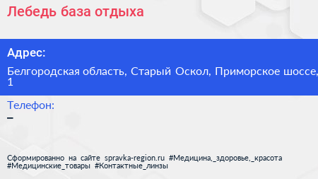 Лебедь, база отдыха по адресу Белгородская область, Старый Оскол, Приморское шоссе, 1 в дальнейшем Организация, размещена в следующих категориях: