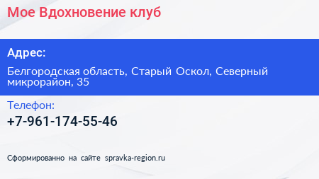 Мое Вдохновение, клуб по адресу Белгородская область, Старый Оскол, Северный микрорайон, 35 в дальнейшем Организация, размещена в следующих категориях: