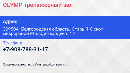 OLYMP, тренажерный зал по адресу 309504, Белгородская область, Старый Оскол, микрорайон Молодогвардеец, 17 в дальнейшем Организация, размещена в следующих категориях: