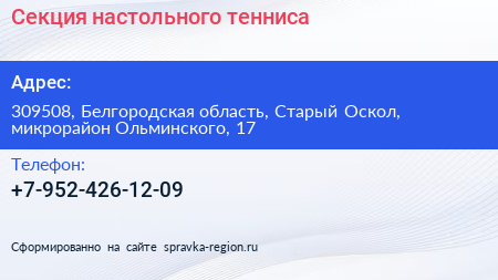 Секция настольного тенниса по адресу 309508, Белгородская область, Старый Оскол, микрорайон Ольминского, 17 в дальнейшем Организация, размещена в следующих категориях: