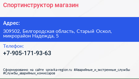 Спортинструктор, магазин по адресу 309502, Белгородская область, Старый Оскол, микрорайон Надежда, 5 в дальнейшем Организация, размещена в следующих категориях: