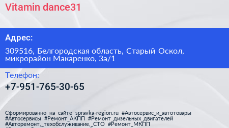 Vitamin dance31 по адресу 309516, Белгородская область, Старый Оскол, микрорайон Макаренко, 3а/1 в дальнейшем Организация, размещена в следующих категориях: