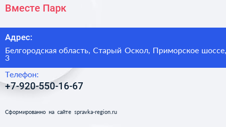 Вместе Парк по адресу Белгородская область, Старый Оскол, Приморское шоссе, 3 в дальнейшем Организация, размещена в следующих категориях: