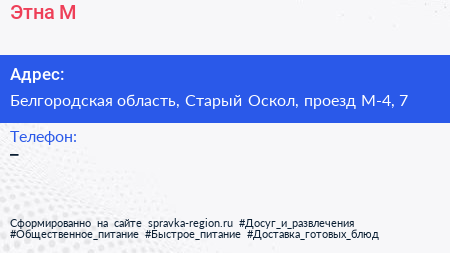 Этна-М по адресу Белгородская область, Старый Оскол, проезд М-4, 7 в дальнейшем Организация, размещена в следующих категориях: