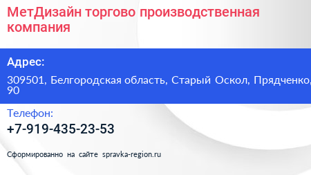 МетДизайн, торгово-производственная компания по адресу 309501, Белгородская область, Старый Оскол, Прядченко, 90 в дальнейшем Организация, размещена в следующих категориях: