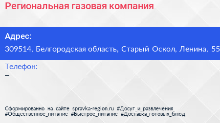 Региональная газовая компания по адресу 309514, Белгородская область, Старый Оскол, Ленина, 55 в дальнейшем Организация, размещена в следующих категориях: