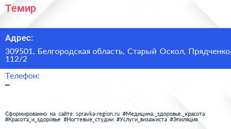 Темир по адресу 309501, Белгородская область, Старый Оскол, Прядченко, 112/2 в дальнейшем Организация, размещена в следующих категориях: