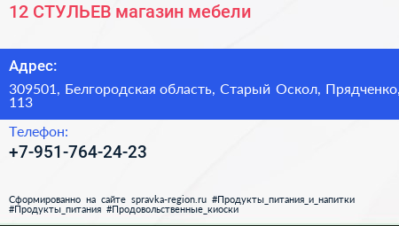 12 СТУЛЬЕВ, магазин мебели по адресу 309501, Белгородская область, Старый Оскол, Прядченко, 113 в дальнейшем Организация, размещена в следующих категориях: