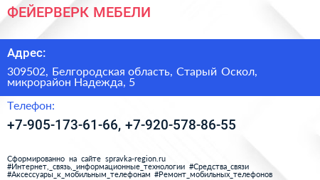 ФЕЙЕРВЕРК МЕБЕЛИ по адресу 309502, Белгородская область, Старый Оскол, микрорайон Надежда, 5 в дальнейшем Организация, размещена в следующих категориях: