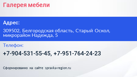 Галерея мебели по адресу 309502, Белгородская область, Старый Оскол, микрорайон Надежда, 5 в дальнейшем Организация, размещена в следующих категориях: