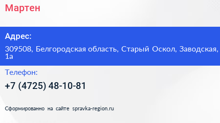 Мартен по адресу 309508, Белгородская область, Старый Оскол, Заводская, 1а в дальнейшем Организация, размещена в следующих категориях: