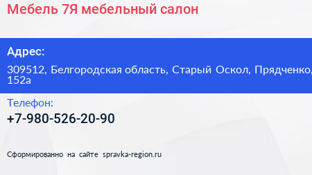 Мебель 7Я, мебельный салон по адресу 309512, Белгородская область, Старый Оскол, Прядченко, 152а в дальнейшем Организация, размещена в следующих категориях: