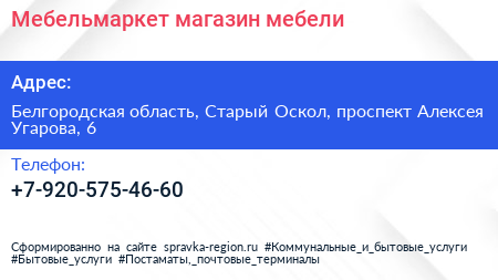 Мебельмаркет, магазин мебели по адресу Белгородская область, Старый Оскол, проспект Алексея Угарова, 6 в дальнейшем Организация, размещена в следующих категориях:
