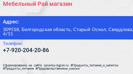 Мебельный Рай, магазин по адресу 309518, Белгородская область, Старый Оскол, Свердлова, 4/15 в дальнейшем Организация, размещена в следующих категориях: