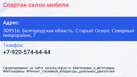Спартак, салон мебели по адресу 309516, Белгородская область, Старый Оскол, Северный микрорайон, 7 в дальнейшем Организация, размещена в следующих категориях: