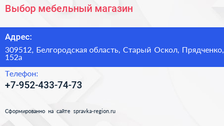 Выбор, мебельный магазин по адресу 309512, Белгородская область, Старый Оскол, Прядченко, 152а в дальнейшем Организация, размещена в следующих категориях: