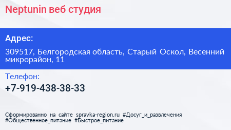 Neptunin, веб-студия по адресу 309517, Белгородская область, Старый Оскол, Весенний микрорайон, 11 в дальнейшем Организация, размещена в следующих категориях: