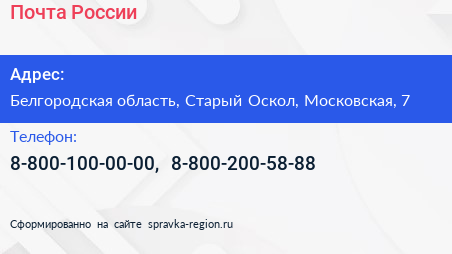 Почта России по адресу Белгородская область, Старый Оскол, Московская, 7 в дальнейшем Организация, размещена в следующих категориях: