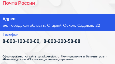 Почта России по адресу Белгородская область, Старый Оскол, Садовая, 22 в дальнейшем Организация, размещена в следующих категориях: