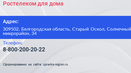 Ростелеком для дома по адресу 309502, Белгородская область, Старый Оскол, Солнечный микрорайон, 34 в дальнейшем Организация, размещена в следующих категориях: