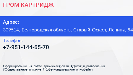 ГРОМ КАРТРИДЖ по адресу 309514, Белгородская область, Старый Оскол, Ленина, 94 в дальнейшем Организация, размещена в следующих категориях: