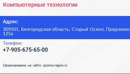 Компьютерные технологии по адресу 309501, Белгородская область, Старый Оскол, Прядченко, 125а в дальнейшем Организация, размещена в следующих категориях: