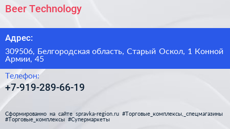Beer Technology по адресу 309506, Белгородская область, Старый Оскол, 1 Конной Армии, 45 в дальнейшем Организация, размещена в следующих категориях: