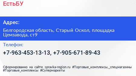 ЕстьБУ по адресу Белгородская область, Старый Оскол, площадка Цемзавода, ст9 в дальнейшем Организация, размещена в следующих категориях: