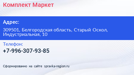 Комплект Маркет по адресу 309501, Белгородская область, Старый Оскол, Индустриальная, 10 в дальнейшем Организация, размещена в следующих категориях: