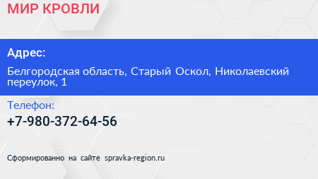 МИР КРОВЛИ по адресу Белгородская область, Старый Оскол, Николаевский переулок, 1 в дальнейшем Организация, размещена в следующих категориях: