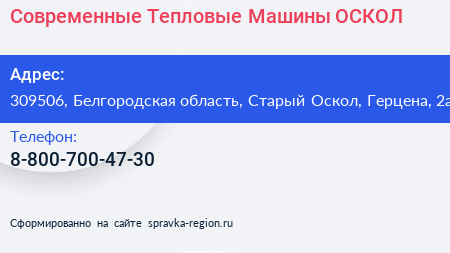 Современные Тепловые Машины-ОСКОЛ по адресу 309506, Белгородская область, Старый Оскол, Герцена, 2а в дальнейшем Организация, размещена в следующих категориях: