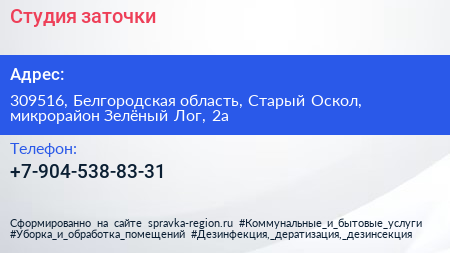 Студия заточки по адресу 309516, Белгородская область, Старый Оскол, микрорайон Зелёный Лог, 2а в дальнейшем Организация, размещена в следующих категориях: