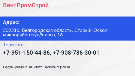 ВентПромСтрой по адресу 309516, Белгородская область, Старый Оскол, микрорайон Будённого, 16 в дальнейшем Организация, размещена в следующих категориях: