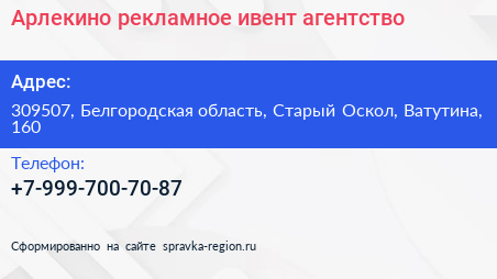 Арлекино, рекламное ивент-агентство по адресу 309507, Белгородская область, Старый Оскол, Ватутина, 160 в дальнейшем Организация, размещена в следующих категориях: