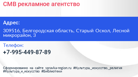 CMB, рекламное агентство по адресу 309516, Белгородская область, Старый Оскол, Лесной микрорайон, 3 в дальнейшем Организация, размещена в следующих категориях: