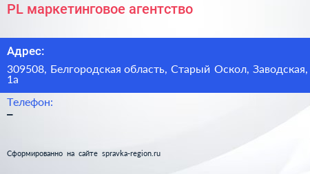 PL, маркетинговое агентство по адресу 309508, Белгородская область, Старый Оскол, Заводская, 1а в дальнейшем Организация, размещена в следующих категориях:
